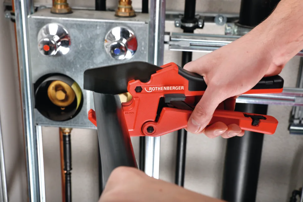 Cortatubos ROCUT Plastic Pro ROTHENBERGER 1000003051 para tubos PE/PP/PVC 15-22 mm (pared ≤2 mm), corte recto preciso, rueda HM, 340 g.